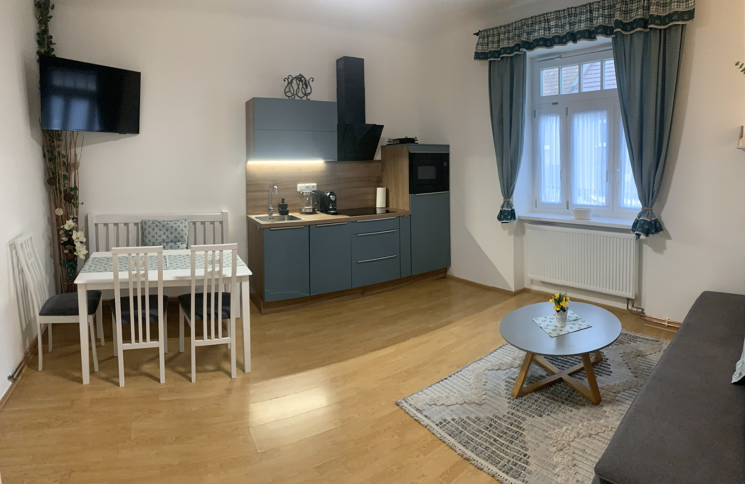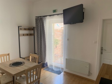 - pokoj s rozkládací sedačkou (v rozloženém stavu 160 cm plnohodnotné pohodlné spaní pro 2 osoby) s plně vybavenou kuchyňskou linkou (lednice, indukční varná deska, mikrovlnná trouba a kávovar na kapsle Nespresso), jídelním stolem a TV