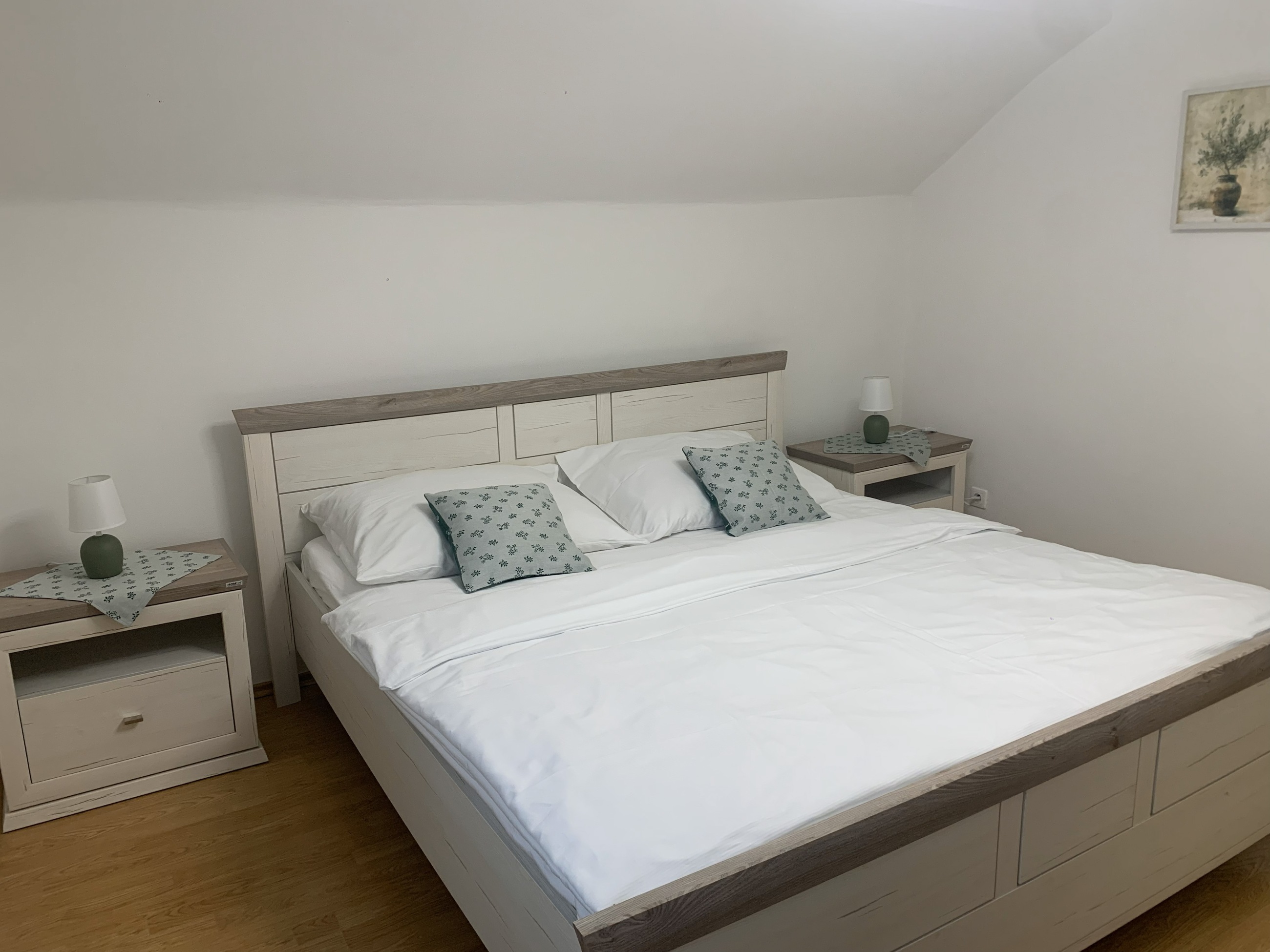 - 2 samostatné dvoulůžkové pokoje (1x pokoj s manželskou postelí v podkroví a 1x pokoj se samostatnými postelemi v přízemí