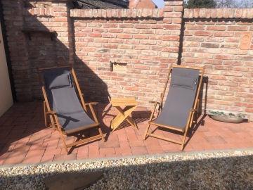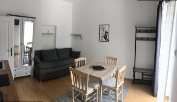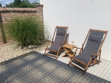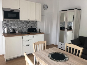 - obývací pokoj s rozkládací sedačkou (plnohodnotné pohodlné spaní pro 2 osoby při rozložení na 160 cm) s plně vybavenou kuchyňskou linkou (lednice, indukční varná deska, mikrovlnná trouba, kávovar na kapsle Nespresso, rychlovarná konvice, nádobí) a jídelním stolem