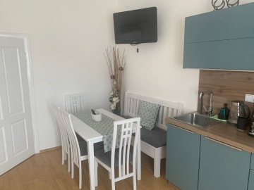 - pokoj s rozkládací sedačkou (v rozloženém stavu 160 cm plnohodnotné pohodlné spaní pro 2 osoby) plně vybavenou kuchyňskou linkou (myčka na nádobí, lednice, indukční varná deska, mikrovlnná trouba a kávovar na kapsle Nespresso), jídelním stolem a TV